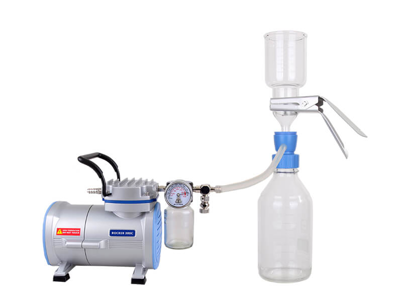 Вакуумный насос, используемый в вакуумной фильтрации, предназначен для извлечения молекул газа в определенном пространстве (обычно в лабораторной колбе или бутыли) для достижения определенной разницы давлений и ускорения фильтрации. Как правило, насос с вакуумом 685 мм рт. ст. способен выполнять большинство экспериментов по фильтрации, поскольку 685 мм рт. ст. соответствует перепаду давления в 90 %. Только для нескольких экспериментов могут потребоваться насосы с более высоким вакуумом. (* 1 атмосфера равна 760 мм рт.ст.)
