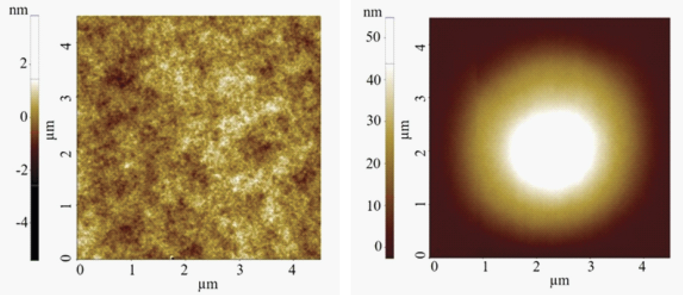В таблице ниже приведены топографические и фазовые изображения полимерной тонкой пленки до и после нагрева и приложения напряжения смещения. Топографическое изображение, полученное до воздействия, показывает гладкую поверхность образца, в то время как фазовое изображение показывает, что поверхность состоит из пластинчатых полимерных фибрилл, равномерно распределенных по поверхности.