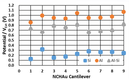 Для проведения измерений методом SKPM был выбран образец с нанесенными на него кремнием, алюминием и золотом. Чтобы измерить такой образец был выбран кантилевер типа NCHAu компании Nanosensors. Данный кантилевер имеет металлическое покрытие на обеих сторонах, а радиус его острия составляет менее 50 нм. Резонансная частота составляет 330 кГц, а жесткость пружины 42 Н/м. Поскольку кантилевер и исследуемый образец изготовлены из различных материалов, то между ними может возникнуть напряжение смещения (как показано на рис. 3e). Чтобы проводить измерения методом SKPM, данное смещение, которое возникает из-за амплитуды VAC, должно быть определено количественно. Для этого необходимо измерить калибровочный образец, например, высокоупорядоченный пиролитический графит (HOPG), работа выхода которого хорошо известна. Следует отметить, что разница между областями с алюминием и золотом должна быть постоянной в соответствии с приложенным направлением, потому что существует очевидная разница в работе выхода.