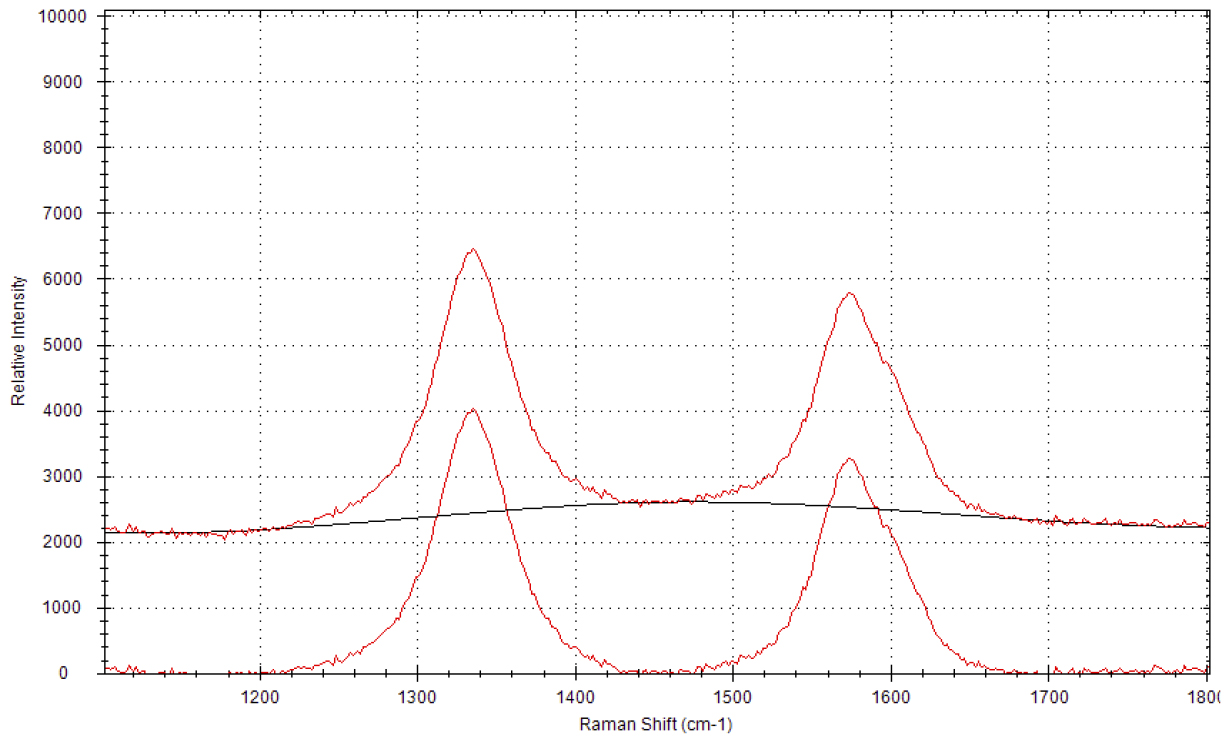 На рисунке 4 представлены рамановские спектры углеродной сажи до и после применения коррекции базовой линией. После применения данной функции интенсивности пиков с легкостью могут быть определены с помощью функции анализа пиков. Далее может быть вычислено отношение интенсивностей пиков для D- и G-полос.