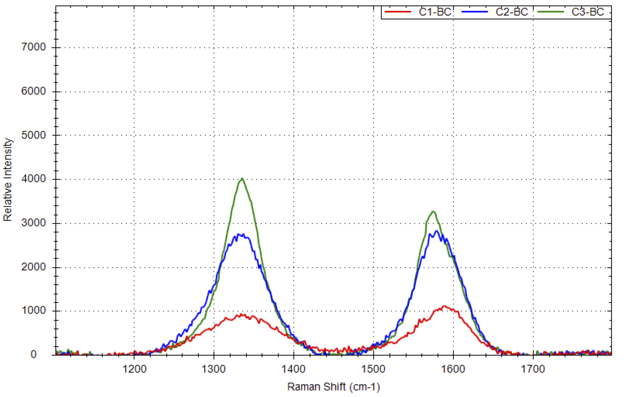 В данном эксперименте при длине волны возбуждения 532 нм, положение пика для D-полосы составляет 1337 см-1. Отношение интенсивностей пиков для образцов C1 и C2 меньше единицы – это показывает, что данные образцы сажи имеют некую степень беспорядочности, которая типична для графитового стержня (образец C1) [3] и графитового порошка (образец C2) [3]. Для образца C3 отношение интенсивностей пиков больше единицы, что говорит о более высокой степени неупорядоченности.