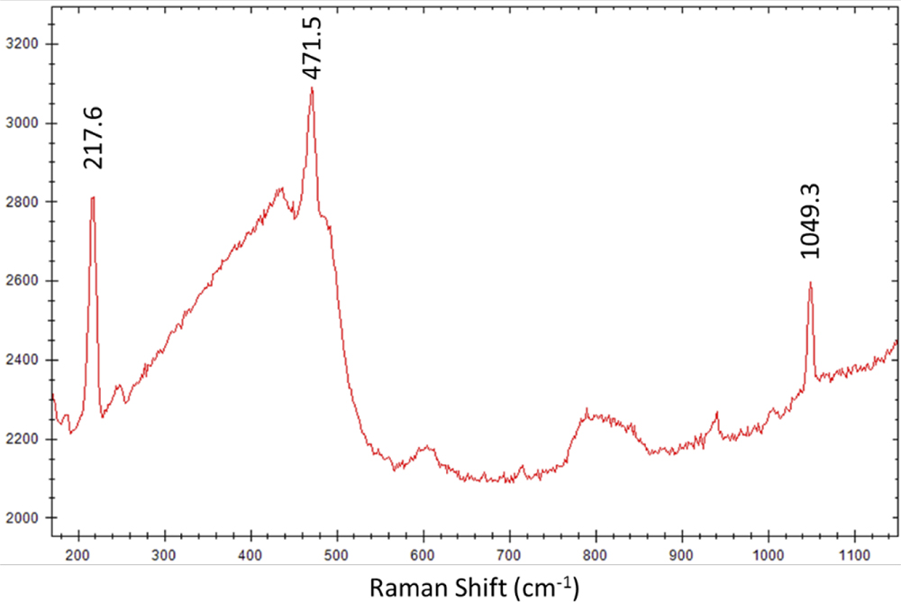 В качестве примера на следующем рисунке приведен измеренный спектр черного пороха, на котором отчетливо наблюдаются пики серы (217.6 см-1 и 471.5 см-1) и селитры (1049.3 см-1). Данное вещество невозможно исследовать с помощью стандартных рамановских спектрометров, поскольку в формируемом лазерном пятне малого диаметра преобладает слишком высокая плотность мощности, что потенциально может привести к сильному перегреву вещества с последующим возгоранием и детонацией – создается опасность поражения оператора вплоть до летального исхода.