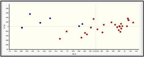 Рис. 6. Данные PCA анализа, показывающие образцы, хранившиеся при комнатной температуре (синий) и образцы, хранившиеся при температуре 40˚С (красный).
