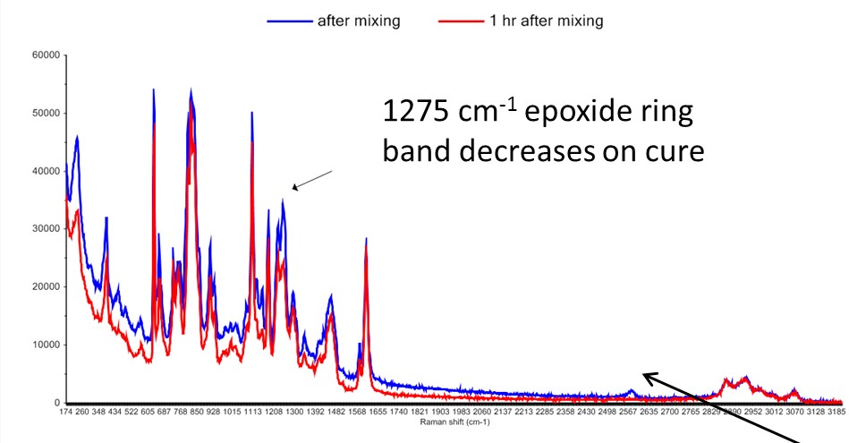 Примером контроля технологического процесса является использование Рамановской спектроскопии для контроля отверждения двух частей эпоксидной смолы. Прибор дает возможность следить за уменьшением интенсивности для линии эпоксидной смолы около 1275 см-1 так как смола затвердевает. Происходит поглощение и это отображается исчезновением пика на 2580 см-1.