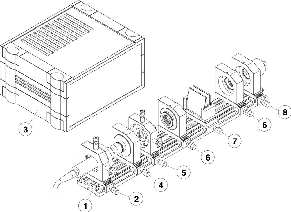 Для накачки Nd:YAG кристалла, который одновременно служит поглотителем и эмиттером, используется лазерный диод с термоэлектрическим охлаждением. Контроллер лазерного диода позволяет устанавливать такие параметры, как температура и ток диода накачки, который определяет длину волны излучения диода. Таким образом, можно проследить спектральный профиль поглощения кристалла. Флуоресценция кристалла собираются специальной оптикой и отсекается узкополосным интерференционным фильтром, пропускающим излучение только на длине волны 1064 нм. Время жизни возбужденного состояния измеряется быстрым кремниевым PIN-фотодиодом. Путем изменения ток на диоде, определяются пороговый уровень генерации лазерного излучения и эффективность наклона кривой выходной мощности лазера. Для отображения измеряемых сигналов необходим двухканальный осциллограф, который может быть заказан дополнительно.