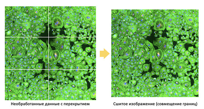Сшивание последовательных, заранее определенных областей полученных изображений значительно упрощает широкомасштабную визуализацию больших образцов. Сшитые изображения можно анализировать как единое целое, но пользователь также может просматривать исходные отдельные изображения для детального изучения конкретных сегментов сшитого изображения.