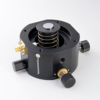 ТГц излучатель (детектор) подсвечивается лазером. Лазерный пучок должен быть сфокусирован между двумя электродами (см. рис. 1а). Зазор между металлическими контактами излучателя больше диаметра лазерного пучка, а зазор между металлическими контактами детектора сравним с диаметром лазерного пучка. В случае ТГц излучателя кремниевая линза (см. рис. 1б) используется для вывода ТГц излучения; в случае ТГц детектора кремниевая линза используется для ввода ТГц излучения. Для позиционирования кремниевой линзы по центру микрополосковой антенны используются регулировочные винты (см. рис. 1а). SMA разъем на боковой стороне корпуса крепления (см. рис. 1в) используется для подвода постоянного напряжения смещения к ТГц излучателю или для подключения усилителя к ТГц детектору. Любое из 3 отверстий с резьбой M6 (см. рис. 1г) может использоваться для крепления ТГц излучателя/детектора к оптическому столу.