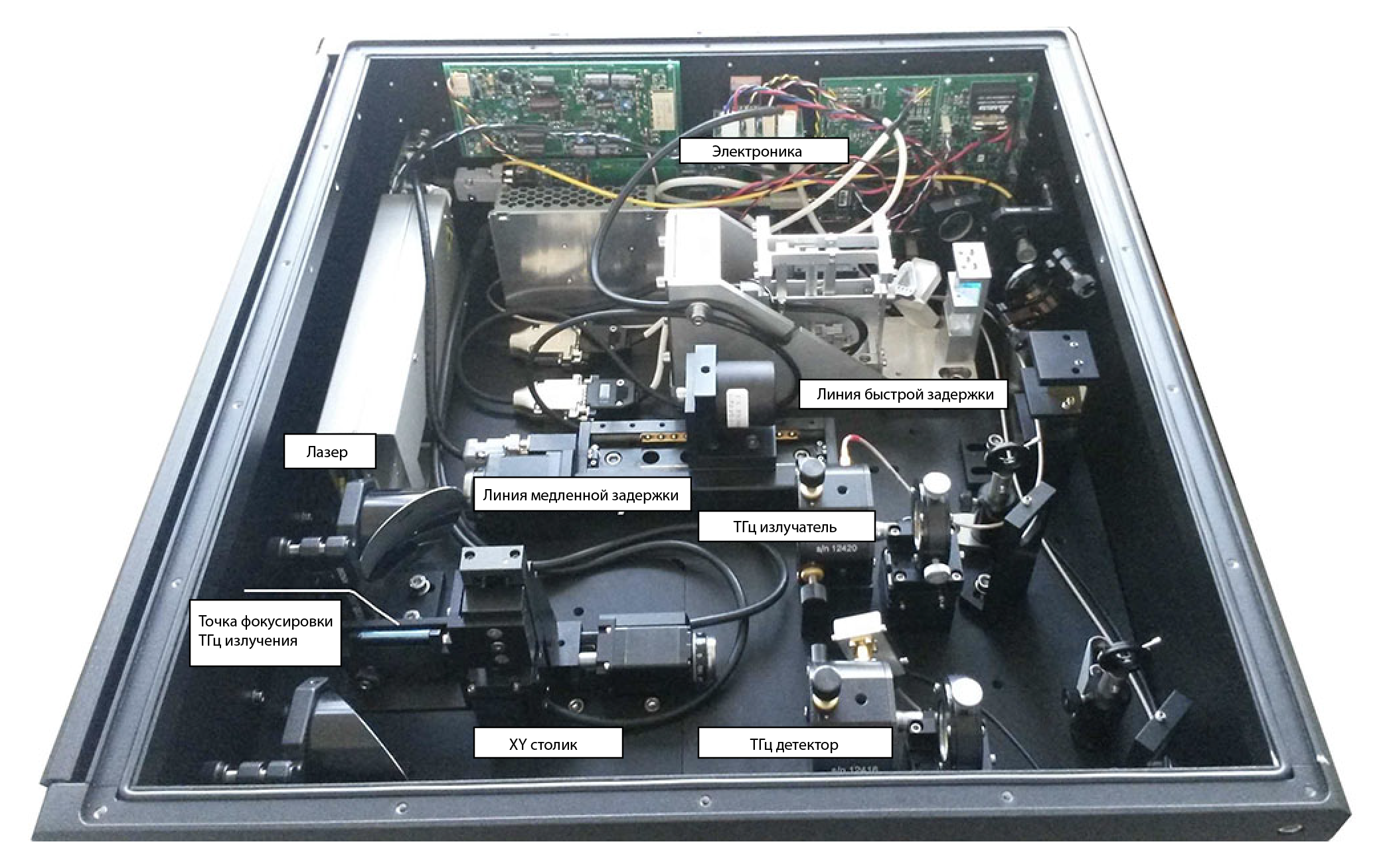 Уникальный дизайн микрополосковой фотопроводящей антенны, изготовленной на подложке из GaAs, выращенной при низких температурах, гарантирует широкополосный спектральный и высокий динамический диапазоны. Система построена с использованием двух линий оптической задержки: быстрой и меленной. Линия быстрой задержки позволяет получать данные в режиме реального времени со скоростью 10 спектров/сек и временным диапазоном 116 пс. Усреднение собираемых спектров позволяет увеличить динамический диапазон до 90 дБ в пике импульса и расширить диапазон сканирования до 5 ТГц. Дополнительная линия медленной задержки позволяет комбинировать несколько временных разрешений, тем самым достигая превосходного спектрального разрешения в 1 ГГц. Линия быстрой задержки имеет бесподшипниковый дизайн и использует магнитосвязанный привод, что делает её особенно надежной и значительно увеличивает срок службы.
